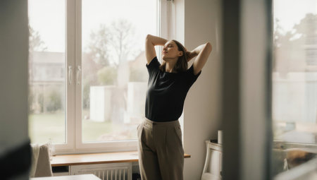 A person stretching near a window, hands behind head, eyes closed, natural light indoors