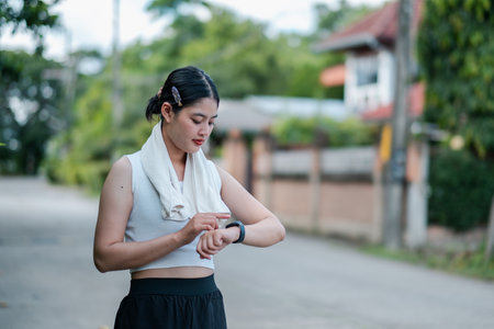 Female runner checking fitness tracker during training