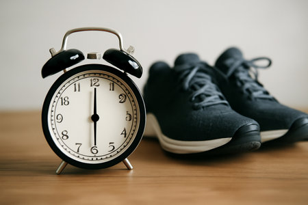 AI generated still life image of an early morning scene featuring an alarm clock showing 6 AM beside running shoes symbolizing motivation discipline and the energy of a fresh start