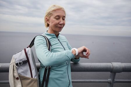 Contemporary mature traveler with backpack lookng at watch on her wirst while waiting for someone by riverside