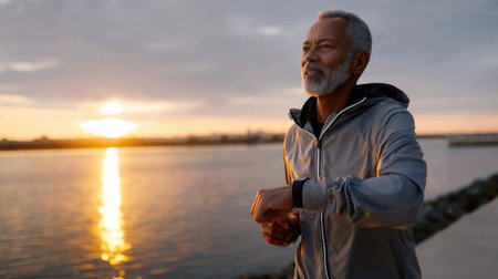 A man is running on a beach at sunset. He is wearing a grey jacket and a watch