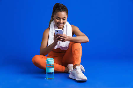 Black young sportswoman using cellphone while sitting on floor isolated over blue background