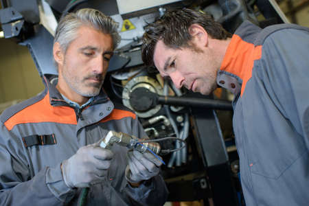 Monthly inspection of safety equipment : Engineering workers, engineers, technicians work as a team work, inspecting the use of hydraulic machinery in industrial plants for safety and efficiency.