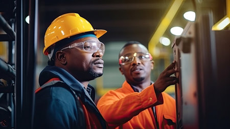 close-up shot of a worker in safety gear inspecting machinery, created with generative ai
