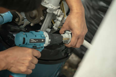 Mechanic man working onsite service on the engine of the car.Car service and maintenance,Repair service.Checks car engine under the hood