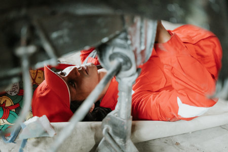 Self service hand use wrench fixing car vehicle,professional women maintenance and repair before travel transportation for reduce accidents safety driving on street road.