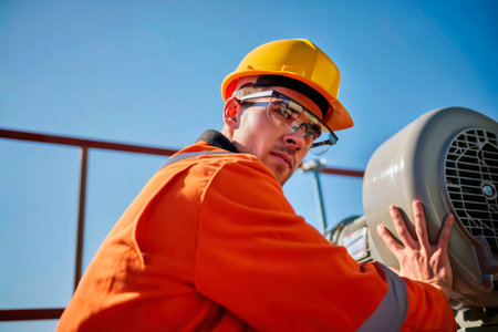 worker in safety gear performing maintenance on machinery, created with generative ai