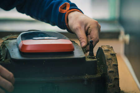 Dirty stripped robotic lawnmower, motorized lawnmower being serviced on a table after a year of use in the mud and grass. Regular maintenance of robotic lawnmower