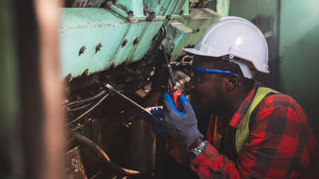 African engineering engine machine controller checking, working and talking on radio communication to tell worker working in industry