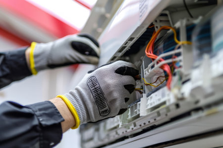 Male technician hands fixing modern air conditioner, repairing and servicing. Maintenance and repairing concept