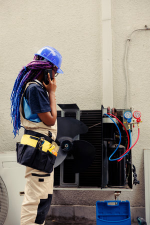 Qualified electrician on the phone with customer after finishing hvac system maintenance inspection. Trained engineer calling client to inform him about electrical issues found in condenser