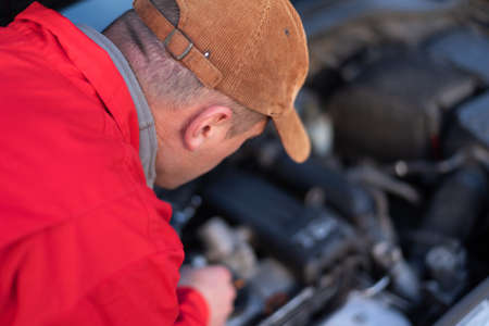 Auto mechanic working on car engine in mechanics garage. Repair service. authentic close-up shot