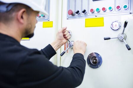 Electrician worker checking electricity meters. Electrical equipment. Background