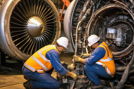 Two qualified specialists are seen repairing aircraft parts, showcasing their expertise and technical skills in aviation maintenance. The image captures the precision and teamwork required in the aviation industry to ensure safety and reliability.
