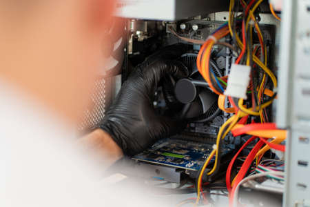 view from behind. computer workshop. repairman installs a cooler in a computer