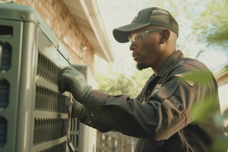 A dedicated technician focuses intently on fixing an air conditioning unit, surrounded by lush greenery. The warm sunlight highlights his precision and expertise in this outdoor setting.