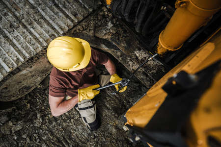 A technician working excavator repair with large iron wrench in a hand, Powerful Professional Mechanic. Heavy Duty Equipment Maintenance. Industrial Concept.