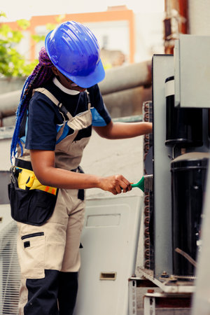 African american expert commissioned for annual air conditioner routine cleaning and maintenance, using soft dusting brush to remove built up layer of dirt and dust from compressor coils