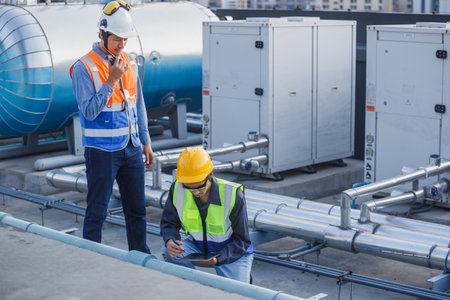 Professional engineer man working checking and maintenance pipeline construction top of the building. Worker in safety uniform using tablet at pipeline construction system