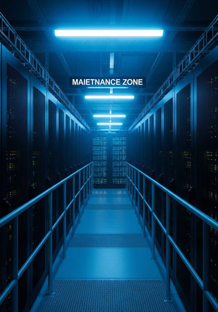 A dimly lit maintenance zone with rows of computer servers and bright blue lighting
