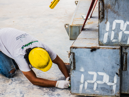 Nonthaburi, Thailand- May 19, 2021: Electrical wireman are preparing cable before install cable to the transformer for a light pole