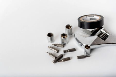 adjustable spanner and other tools on a white background