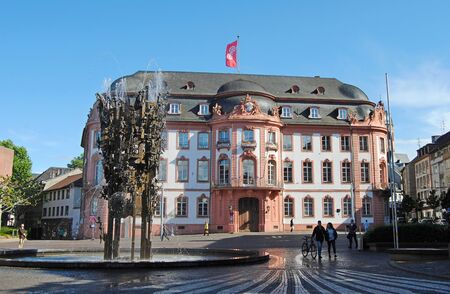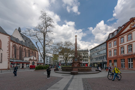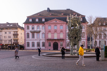 Mainz, Germany - Jan 24, 2026: People walk near the Fastnachtsbrunnen fountain in Mainz.
