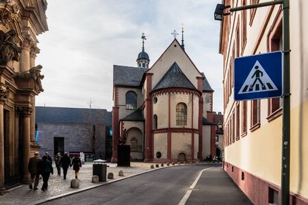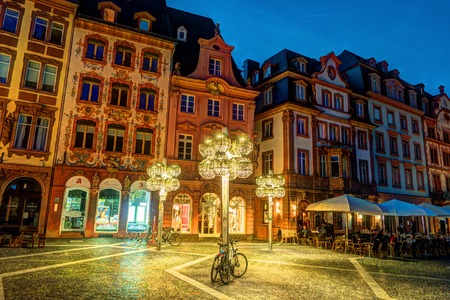 Mainz, Germany - August 11, 2018: Old Town of Mainz with Mainz Cathedral in the background, evening view scene with walking people