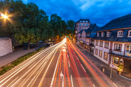Mainz, Germany - June 12, 2017: Evening street with car light trails and old architecture buildings