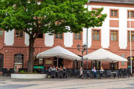 Mainz, Germany - May 27, 2019: Pedestrians and passers-by as well as restaurant visitors of the Hintz and Kuntz in front of the Gutenberg Museum on May 27, 2015 in Mainz.