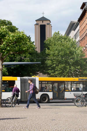 Mainz, Germany - June 5, 2014: The station forecourt with pedestrians, a passing bus and the tower of St. Boniface monastery on June 05, 2014 in Mainz.