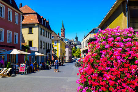 Wurzburg, Germany - July 4, 2019: Summer cityscape of Wuzburg. Tourists and residents on a street in the center of the old city with cathedral and city hall. Wurzburg is a city located on Main River.