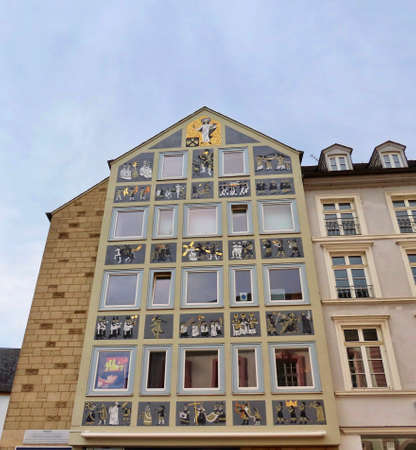 Traditional house with religious themed pictures on facade in Trier, Rhineland-Palatinate, Germany - October 20, 2020