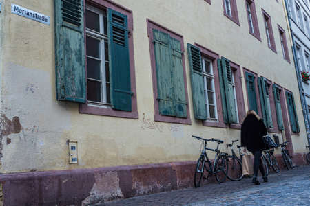 Heidelberg, Germany - December 2019: Woman is passing an old house with some bicycles