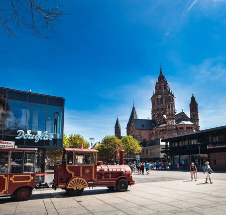Mainz, Germany - August 12, 2018: Tourist train in Old Town of Mainz with Mainz Cathedral in the background, day view scene with walking people