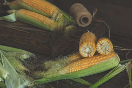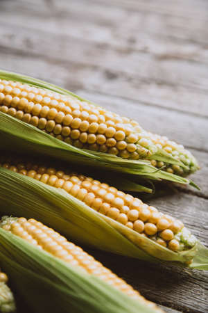 Fresh sweet corn on cobs on rustic wooden table, close up. Toned. Shallow depth of field.