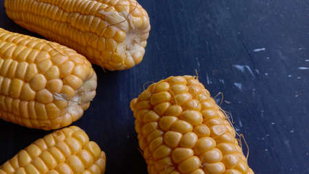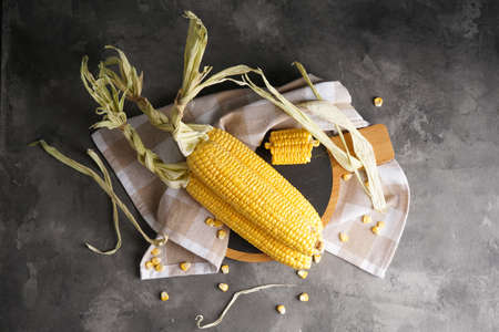 Corn on a dark cement background close-up with copyspace.