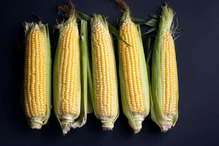 Fresh corn cobs on a black background. Harvest organic food.