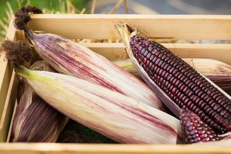 Fresh purple corn in the wooden box for background.Thailand