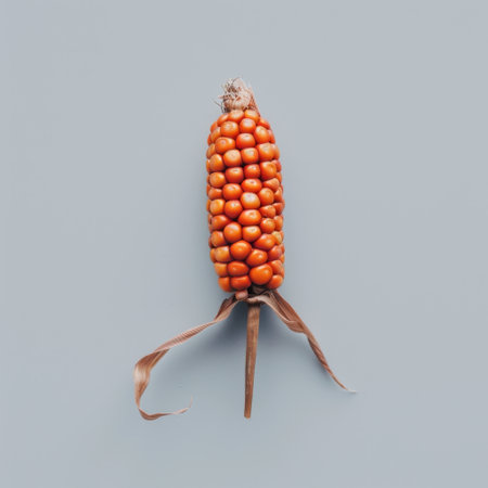 A bright orange corn cob stands prominently against a grey backdrop, highlighting its unique features and textures, ideal for various food and agriculture projects.