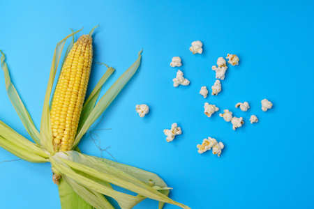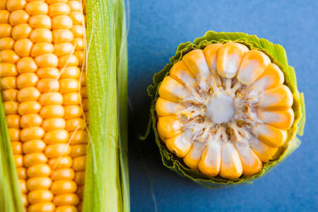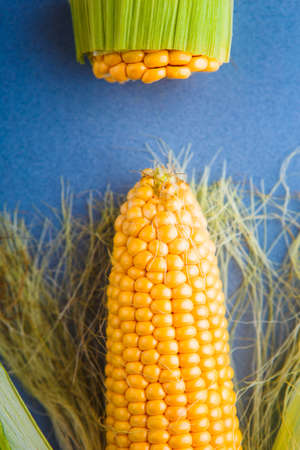 Corn on a yellow-blue background. Open and closed cobs. Flat lay. Food concept.