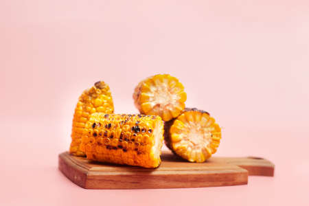 grilled corn on a pastel pink background, copies of space