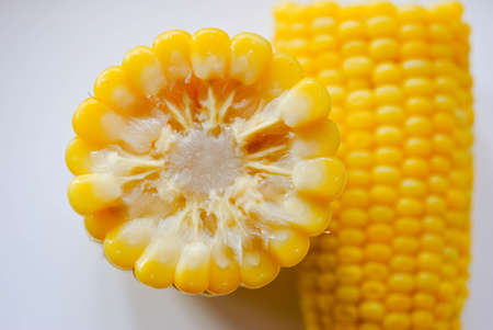 Boiled yellow sweet corn on a white background. Texture. Creative food. Swings of corn. Whole and portions of corn. Ecological food concept. Selective focus.