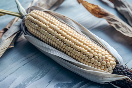 Unpeeled ear of corn on blue