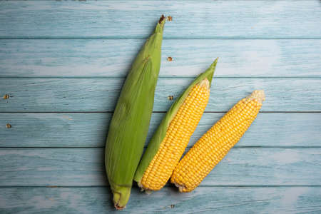 Fresh corn cobs on flat wooden background