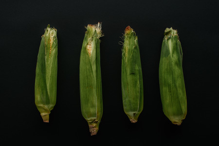 flat lay with arranged raw fresh corn cobs isolated on black