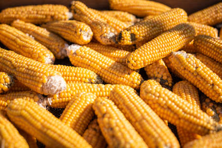 Many ears of yellow dry corn in the sunlight. Corn storage