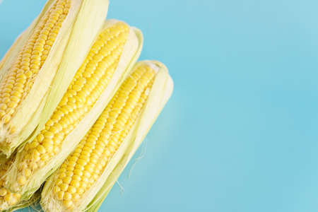 Three raw big corn on a blue background. View from above. Harvesting concept.