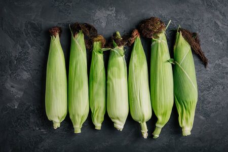 Fresh sweet golden corn on cobs on dark gray stone background, top view