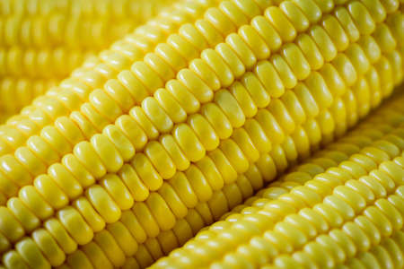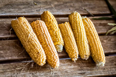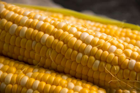 Close up shot of corn cobs, yellow grains of maize. Agriculture and healthy eating concept.
